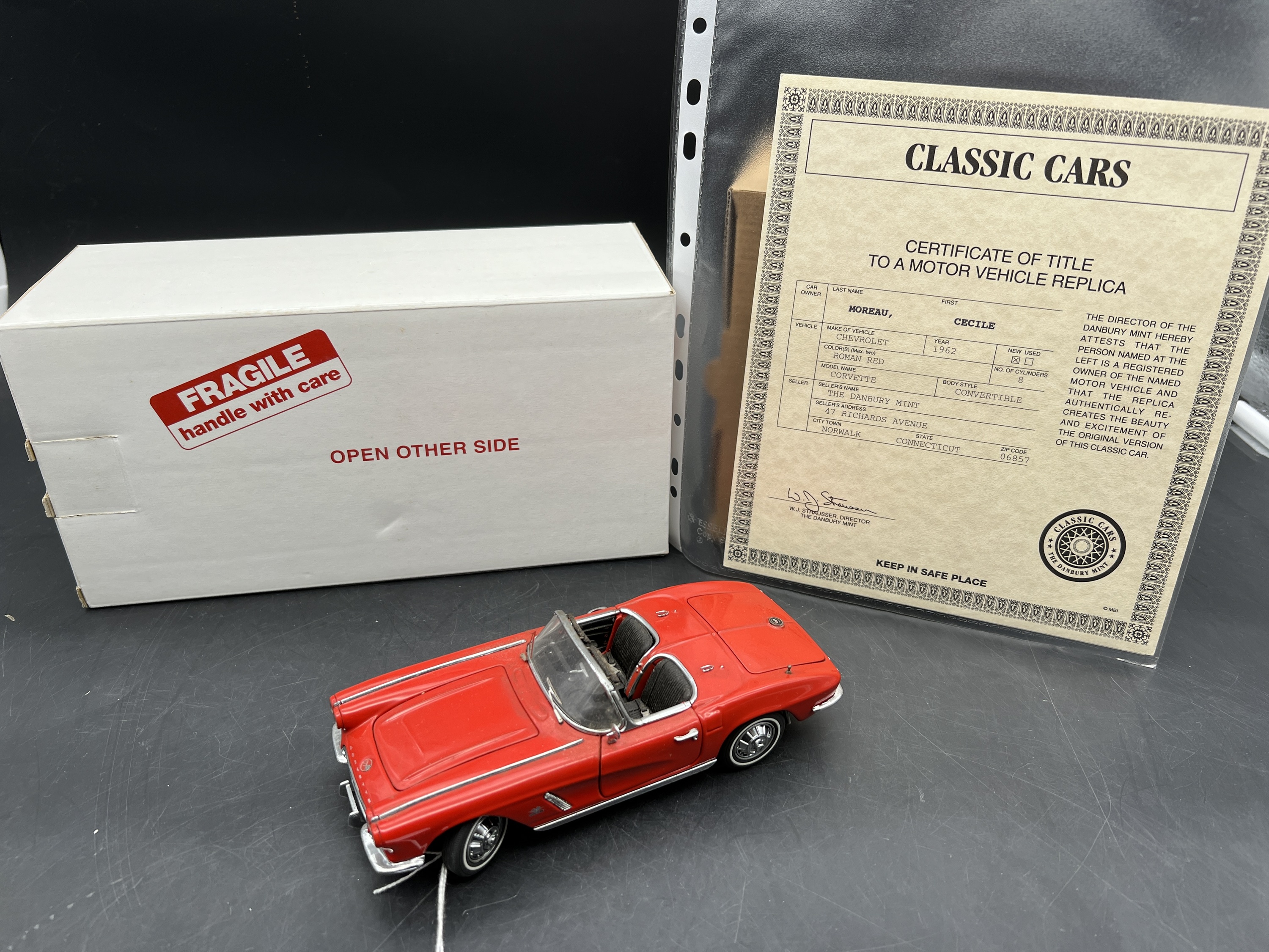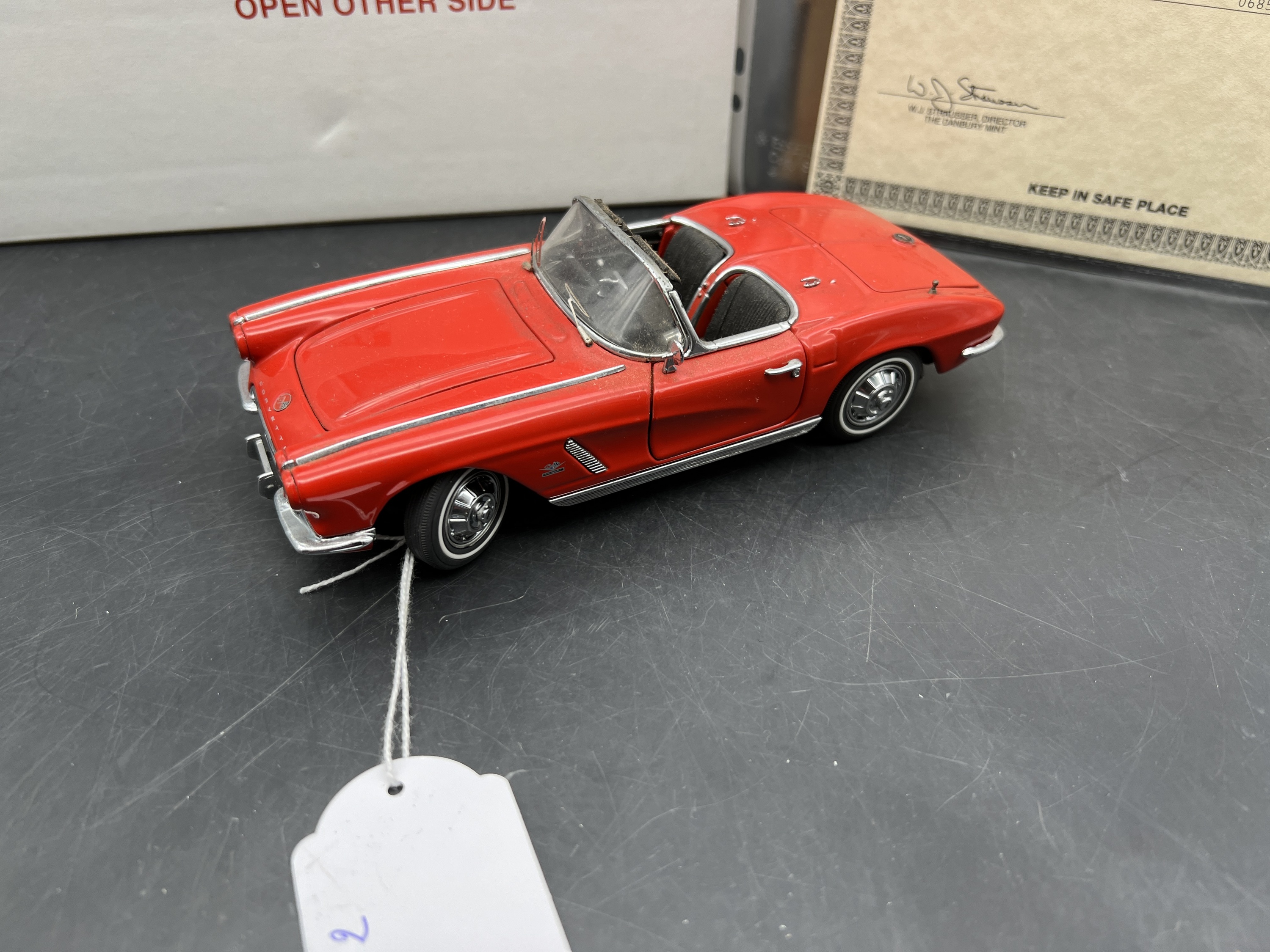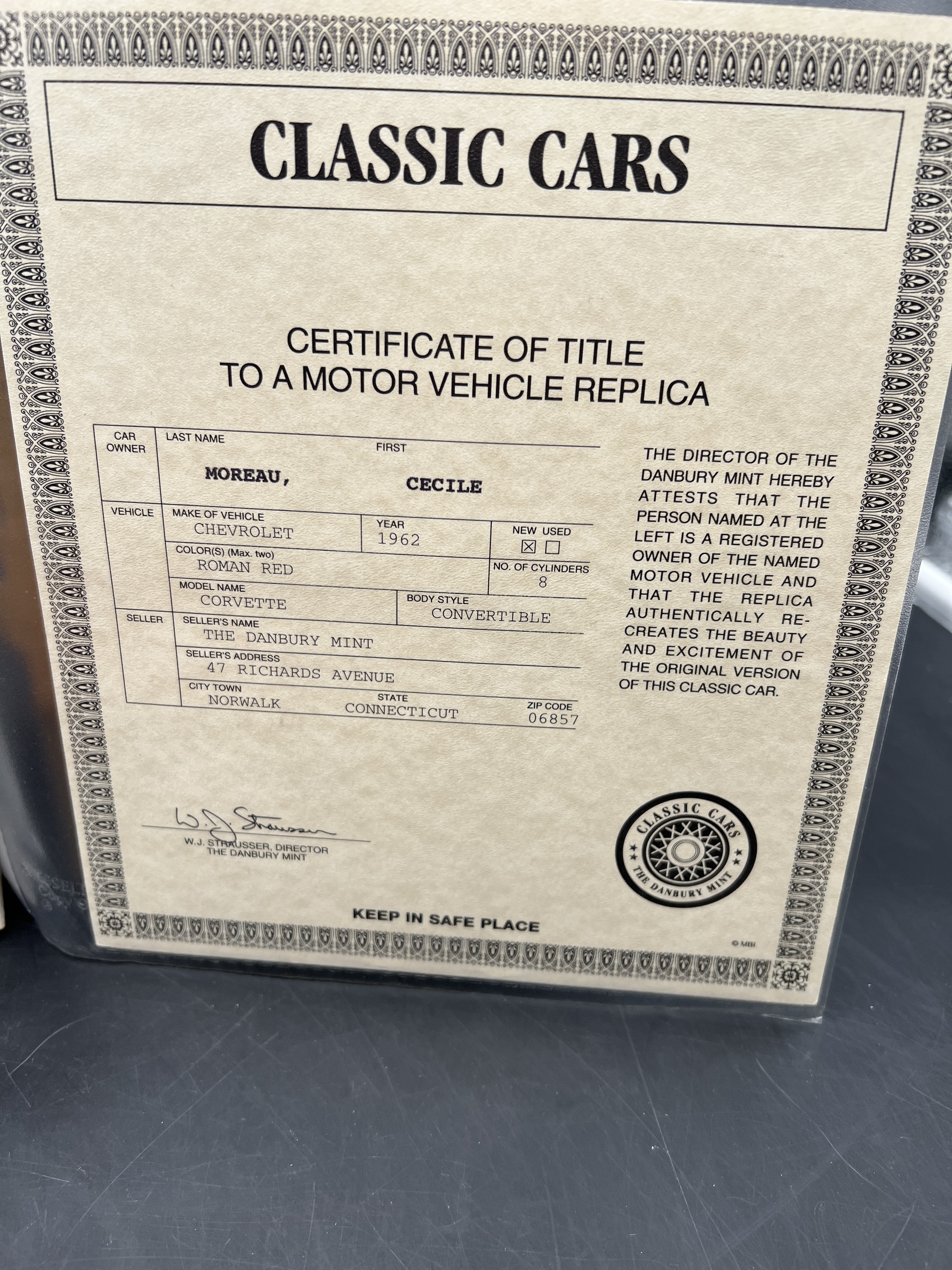 Danbury Mint Model 1/24è, voiture Chevrolet Corvette rouge convertible 1962, boîte + certificat + explicatif