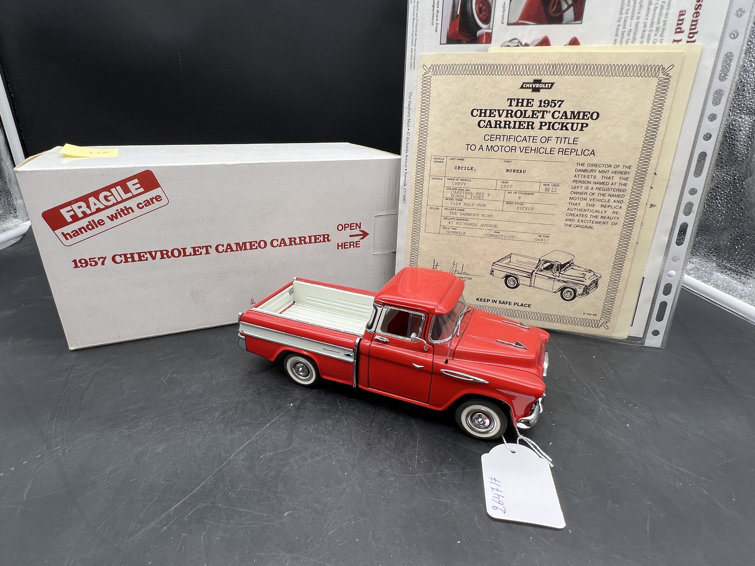 Danbury Mint Model 1/24è, voiture Chevy Cardinal red, bombay ivory 3124 Half-ton Pickup 1957, boîte + certificat