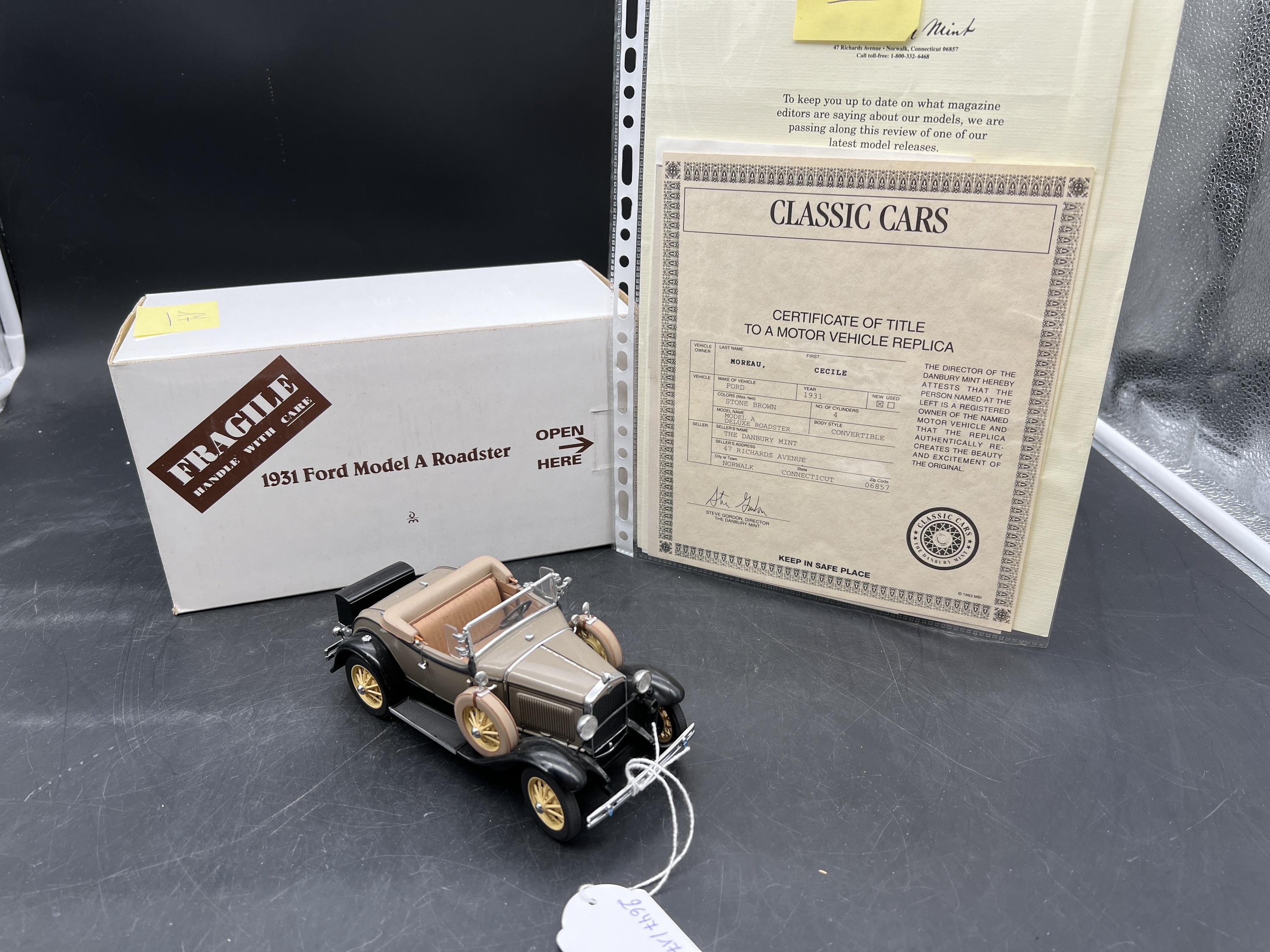 Danbury Mint Model 1/24è, Voiture Ford Stonbrow Model A de luxe Roadster convertible, boîte + certificat + explicatif