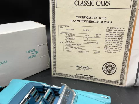 Danbury Mint Model 1/24è, Voiture Chevrolet Impala turquoise 1958 convertible, boîte + certificat + explicatif
