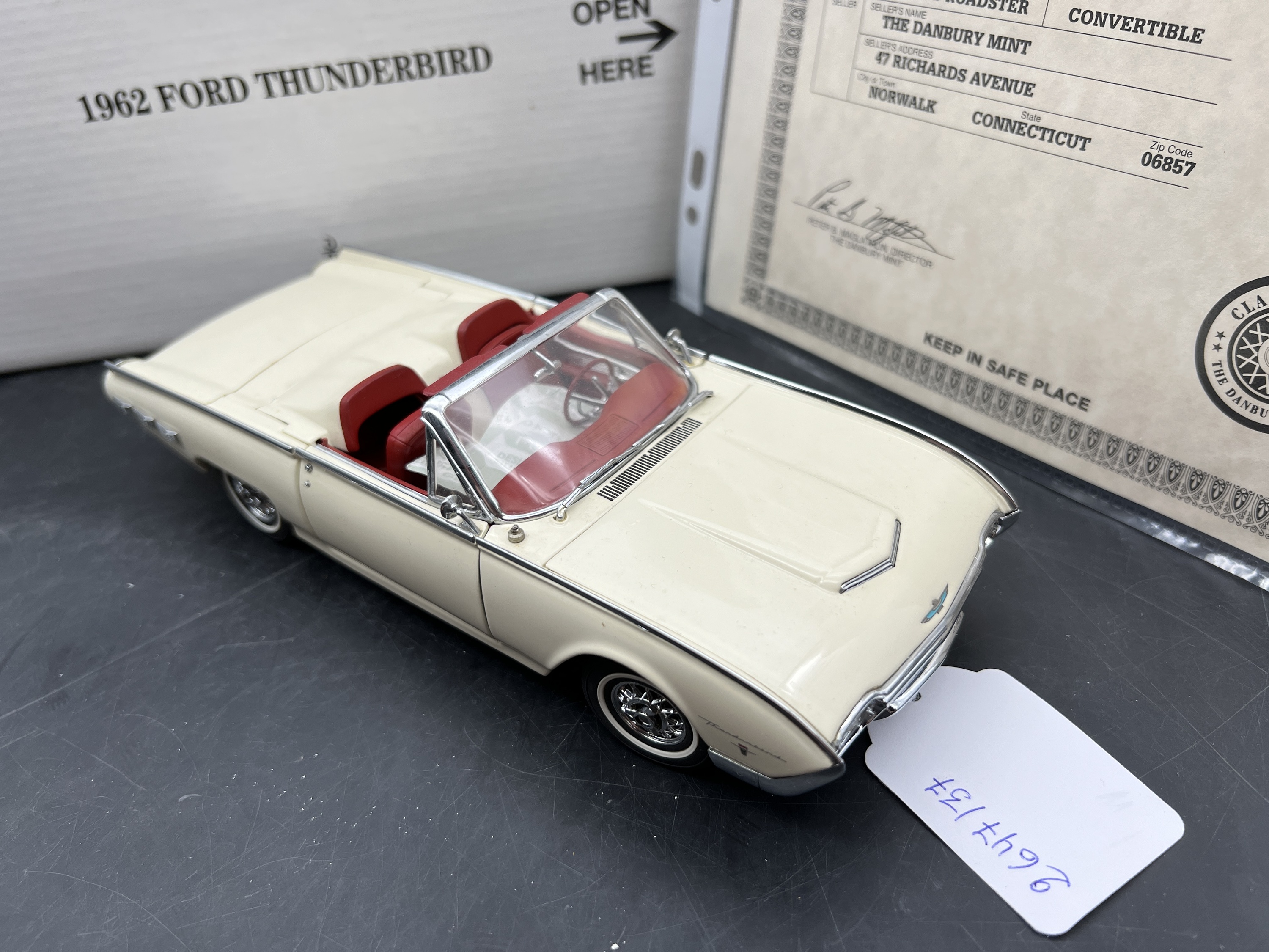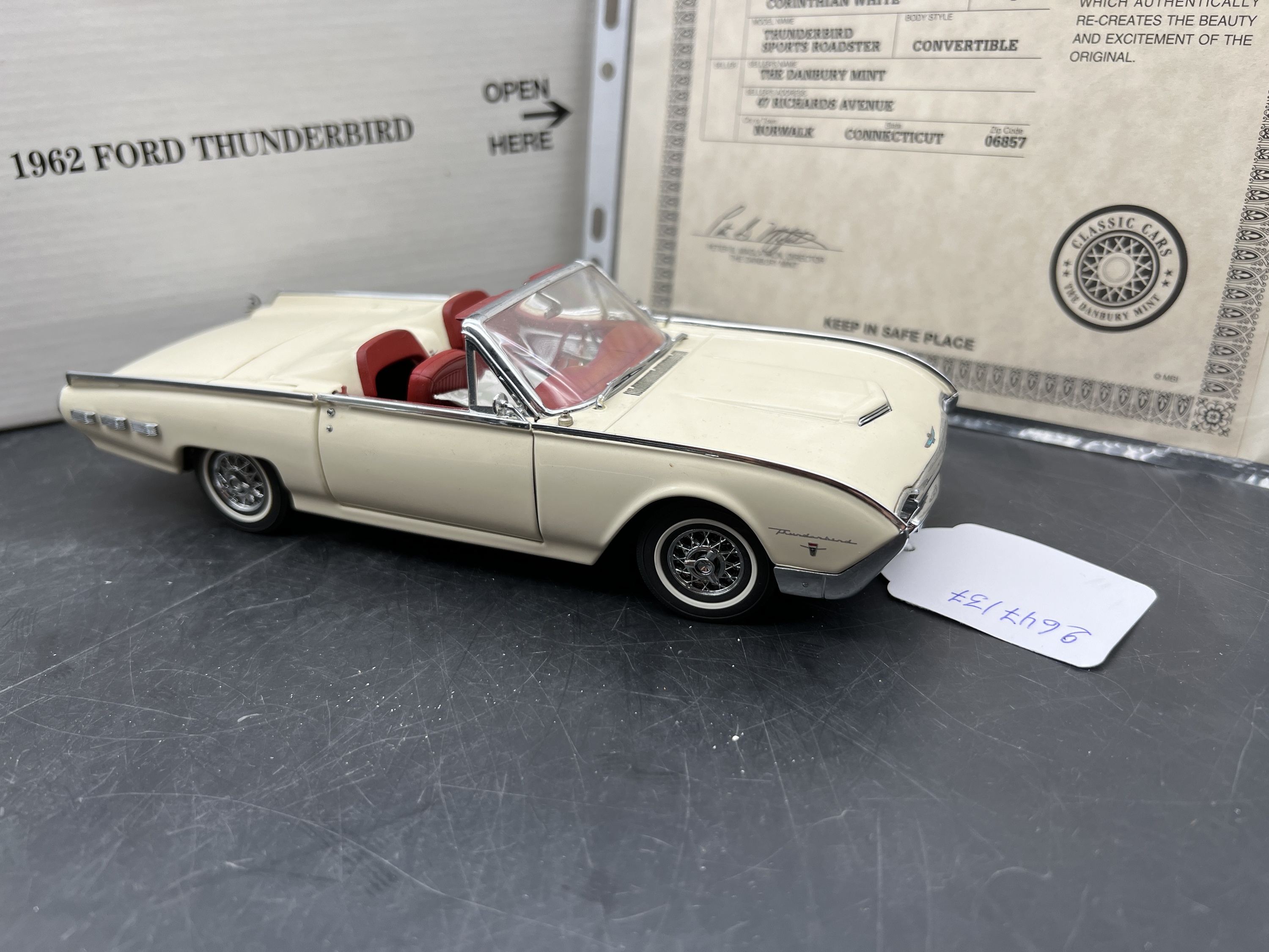 Danbury Mint Model 1/24è,Voiture Ford Thunderbird Sport Roadster convertible Corinthian white 1962, boîte + certificat + explicatif