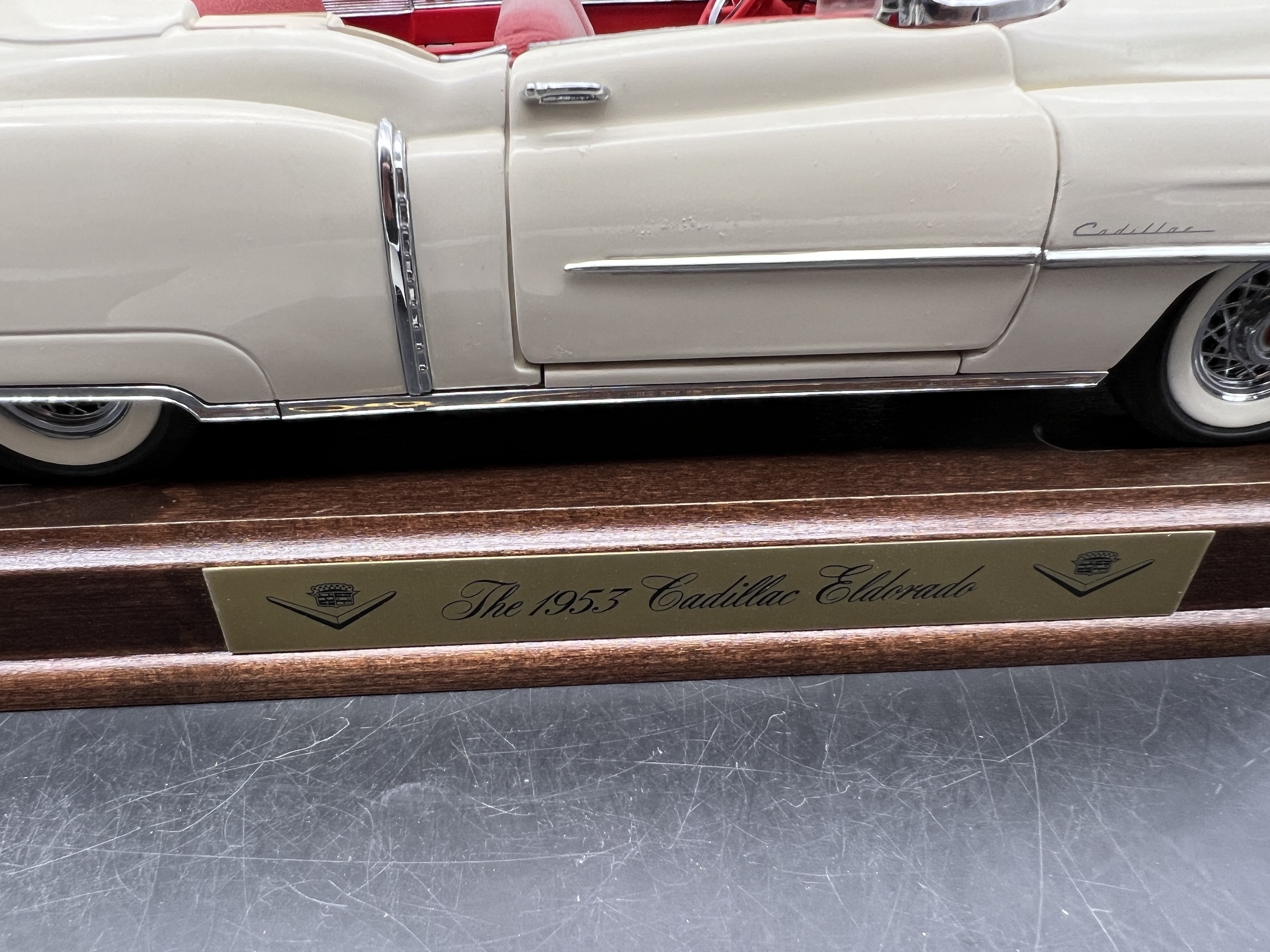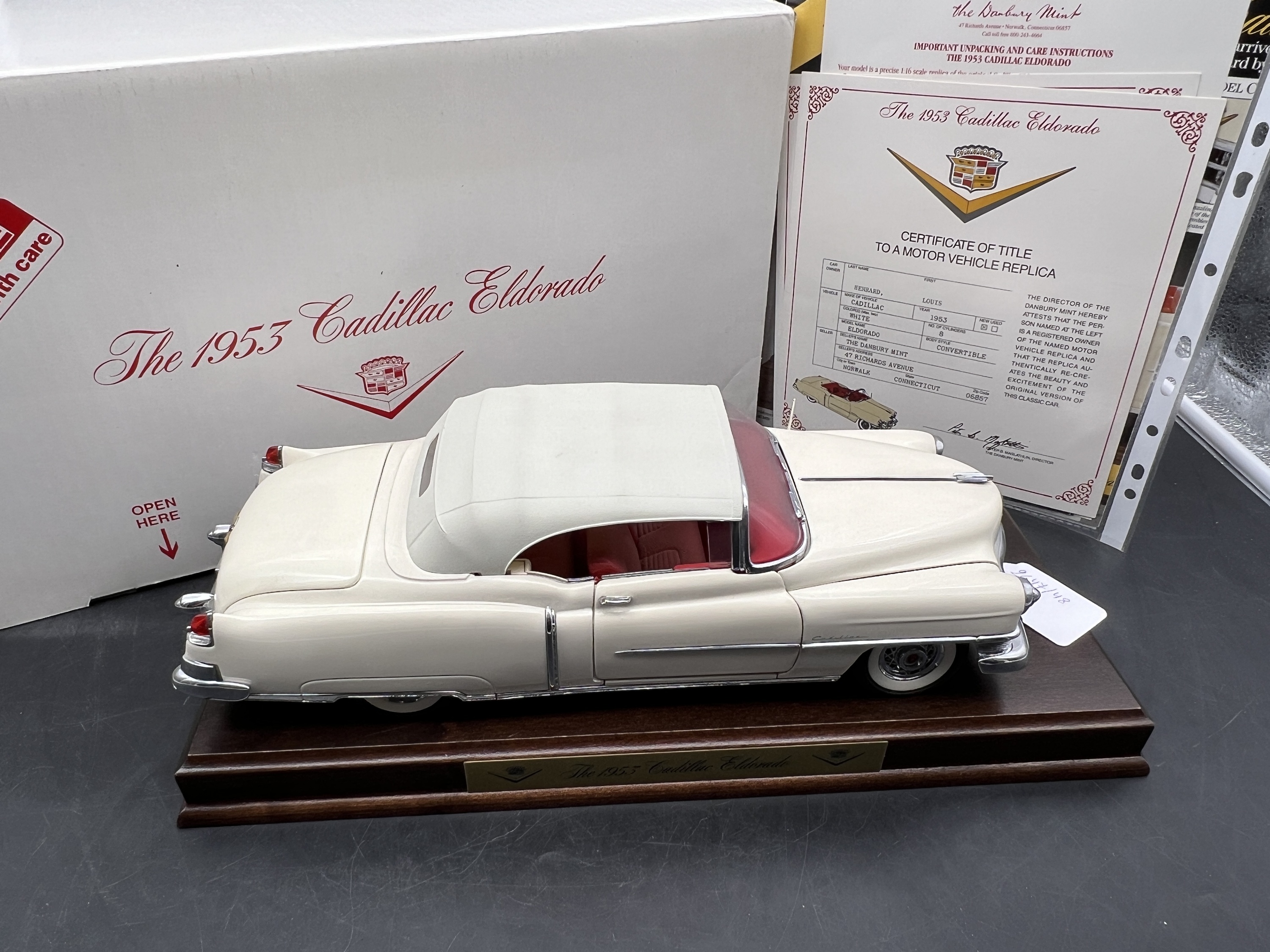 Danbury Mint Model 1/24è, Voiture Cadillac Eldorado convertible blanche 1953, boite + certificat + plaque de présentation