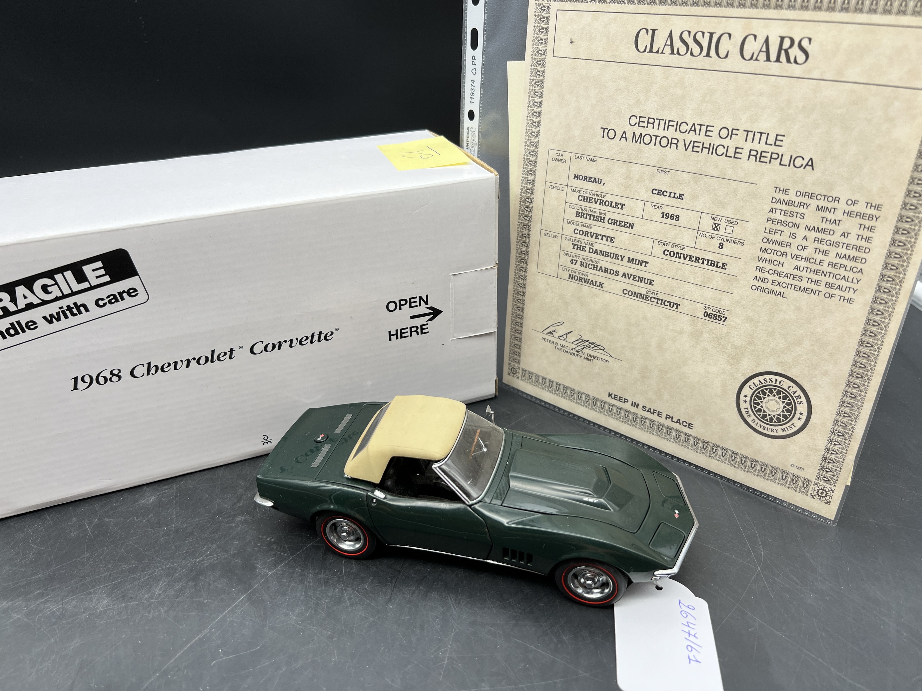 Danbury Mint Model 1/24è, Voiture Chevrolet corvette convertible British green 1968, boite + certificat