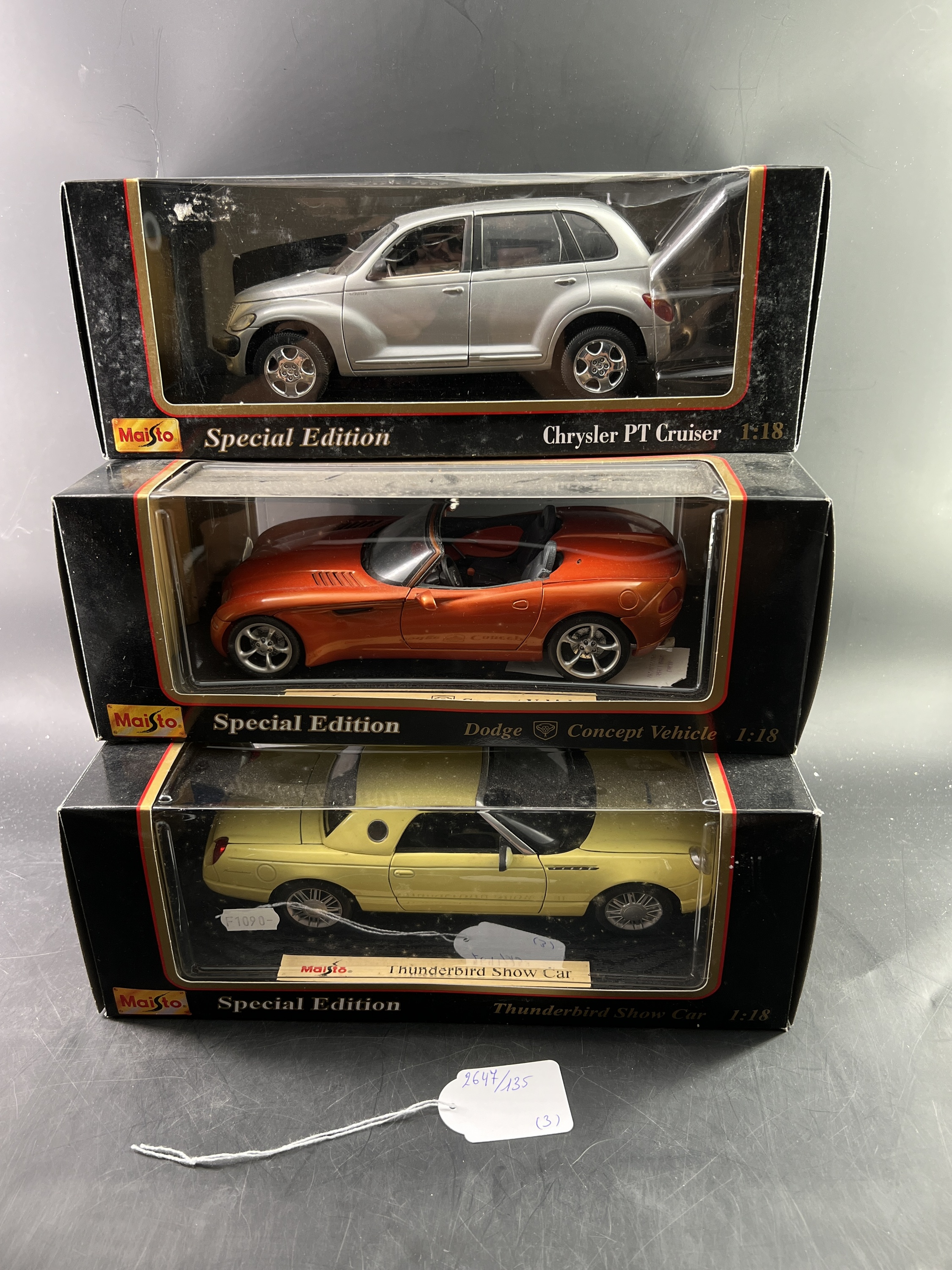 Lot de 3 Maisto Special Edition 1/18ème: Thunderbird Show Car, Dodge concept Vehicule, Chrysler PT Cruiser