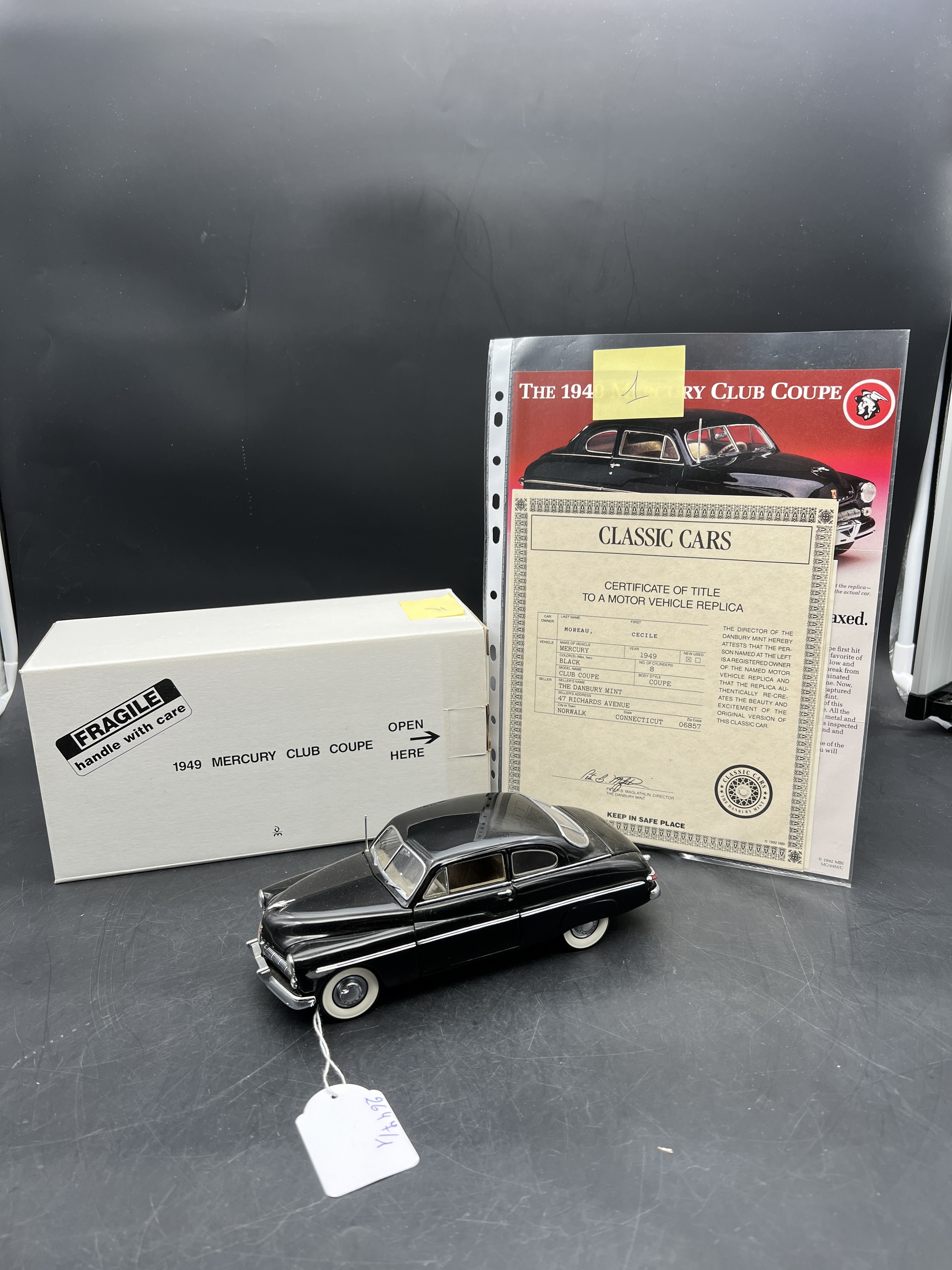 Danbury Mint Model 1/24è, voiture Mercury noire coupé 1949, boîte + certificat + explicatif