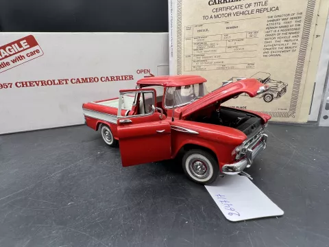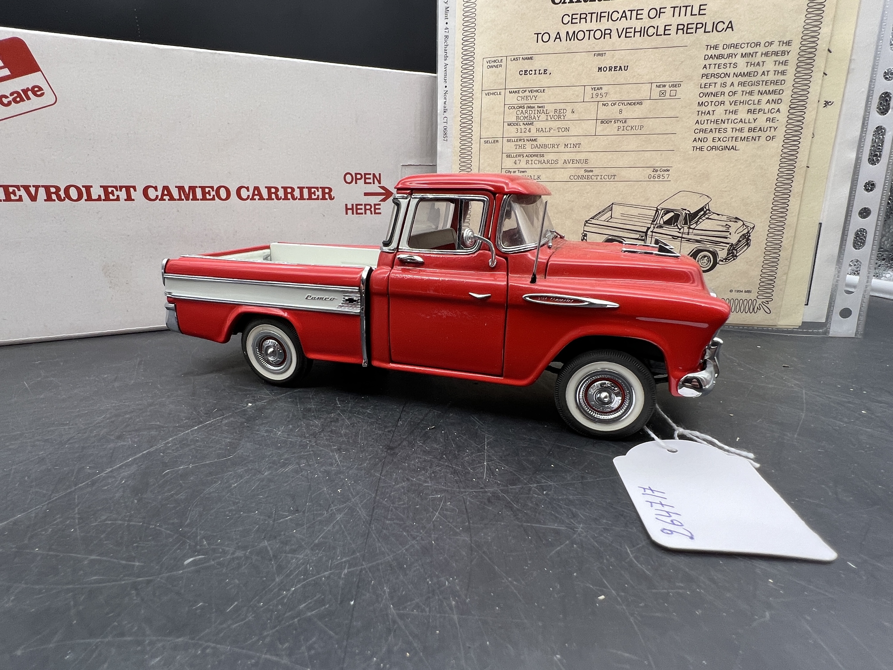 Danbury Mint Model 1/24è, voiture Chevy Cardinal red, bombay ivory 3124 Half-ton Pickup 1957, boîte + certificat