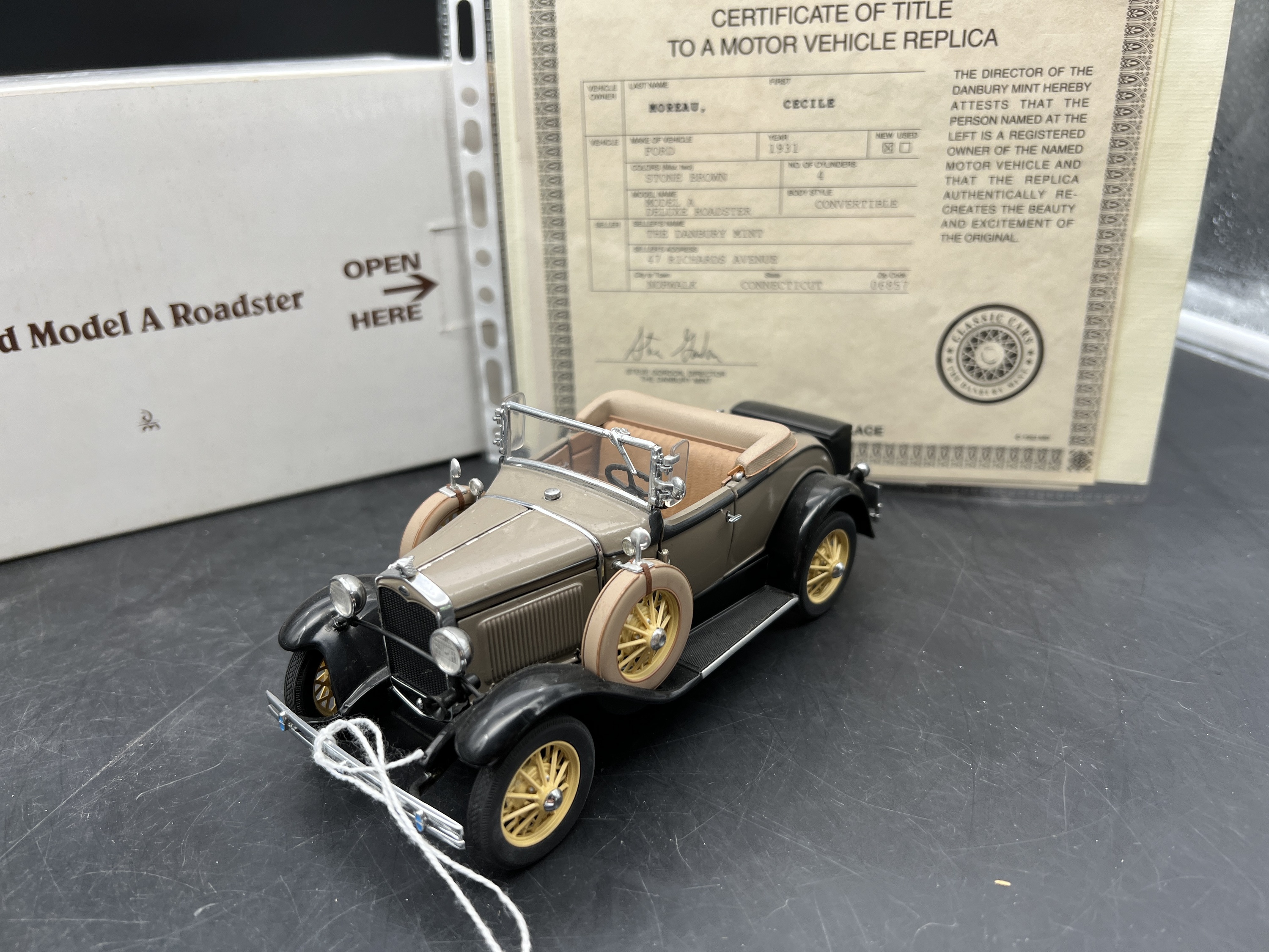 Danbury Mint Model 1/24è, Voiture Ford Stonbrow Model A de luxe Roadster convertible, boîte + certificat + explicatif