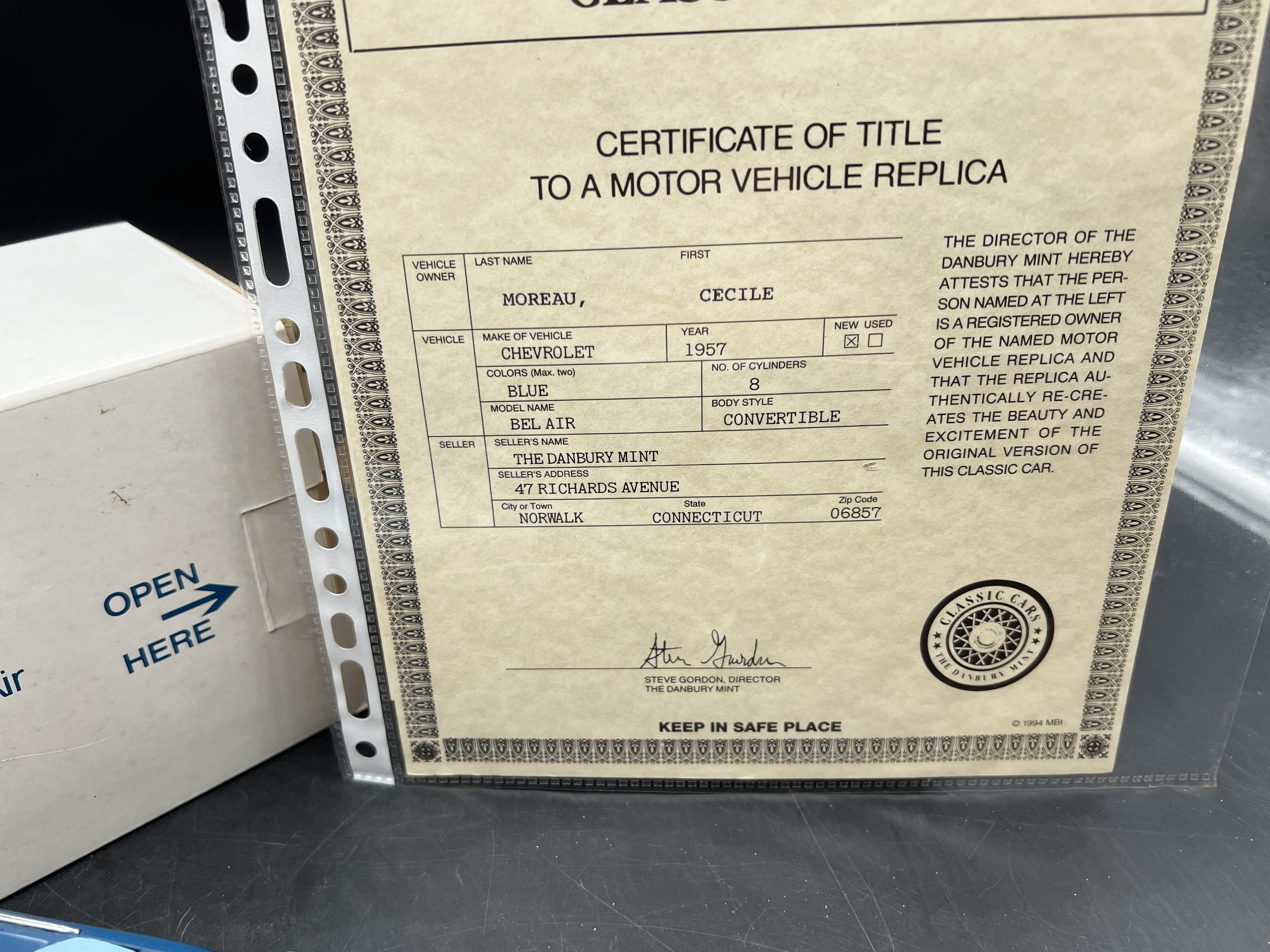 Danbury Mint Model 1/24è, Voiture Chevrolet Bel Air Blue 1957, boîte + certificat
