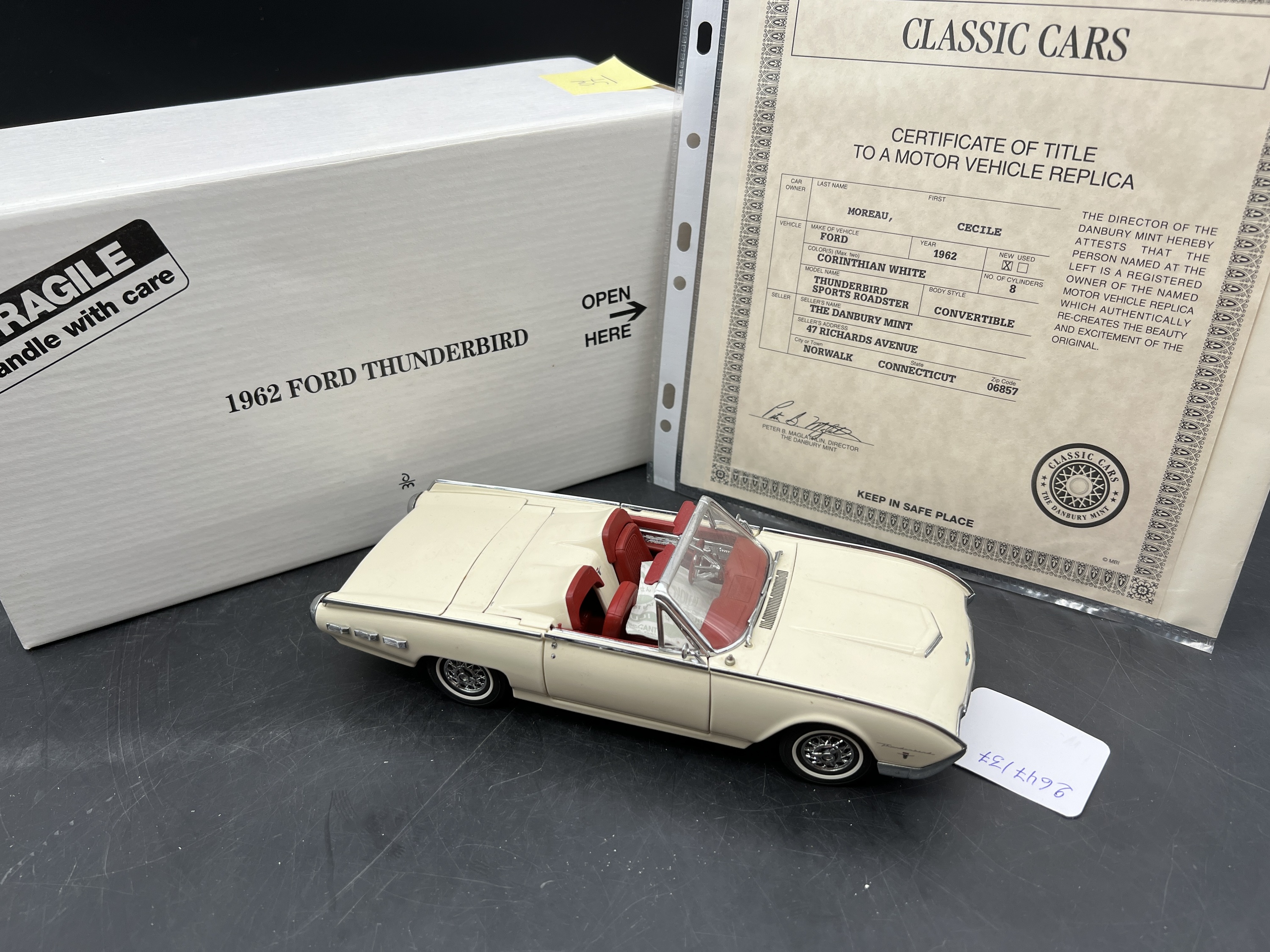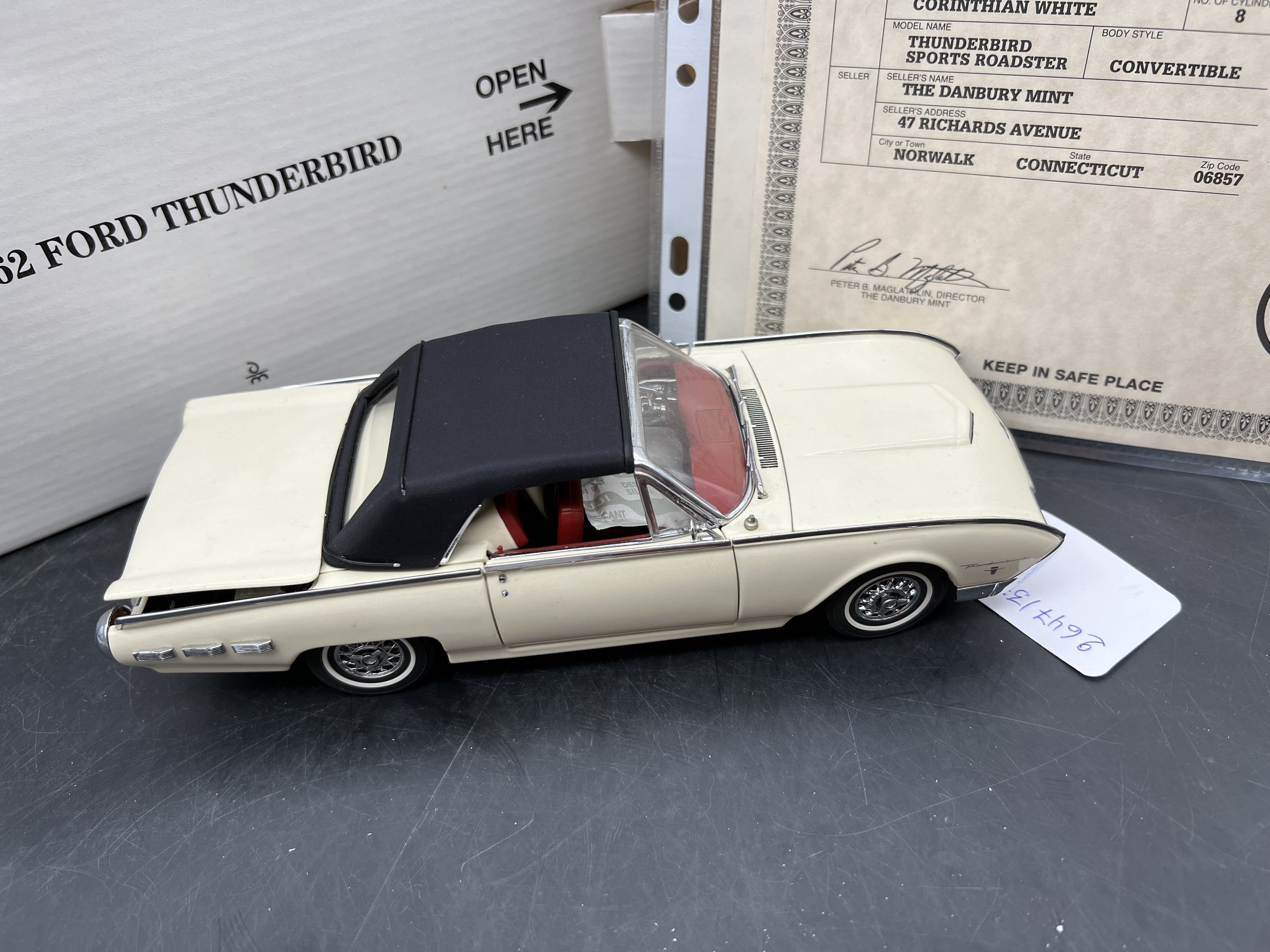 Danbury Mint Model 1/24è,Voiture Ford Thunderbird Sport Roadster convertible Corinthian white 1962, boîte + certificat + explicatif