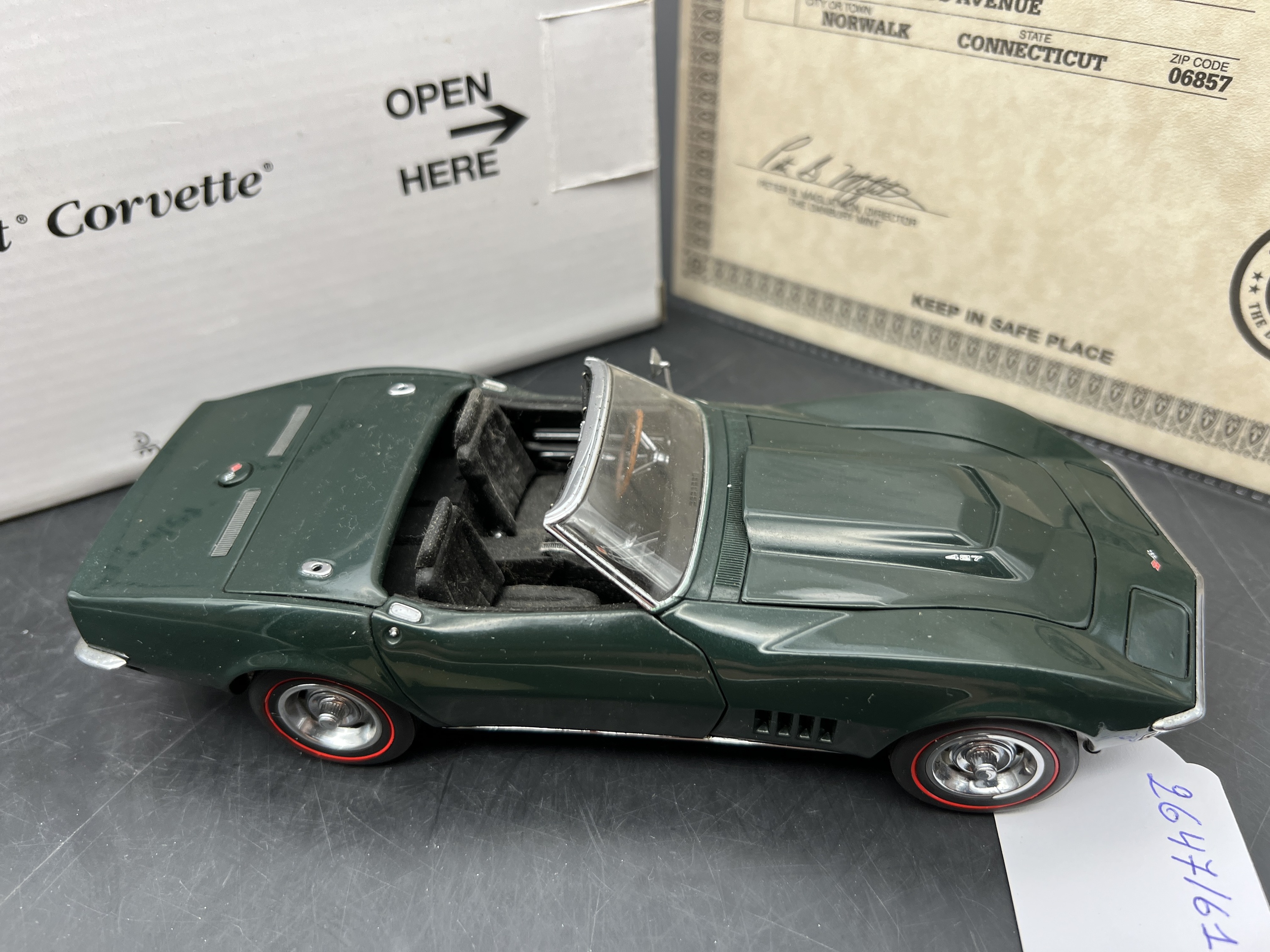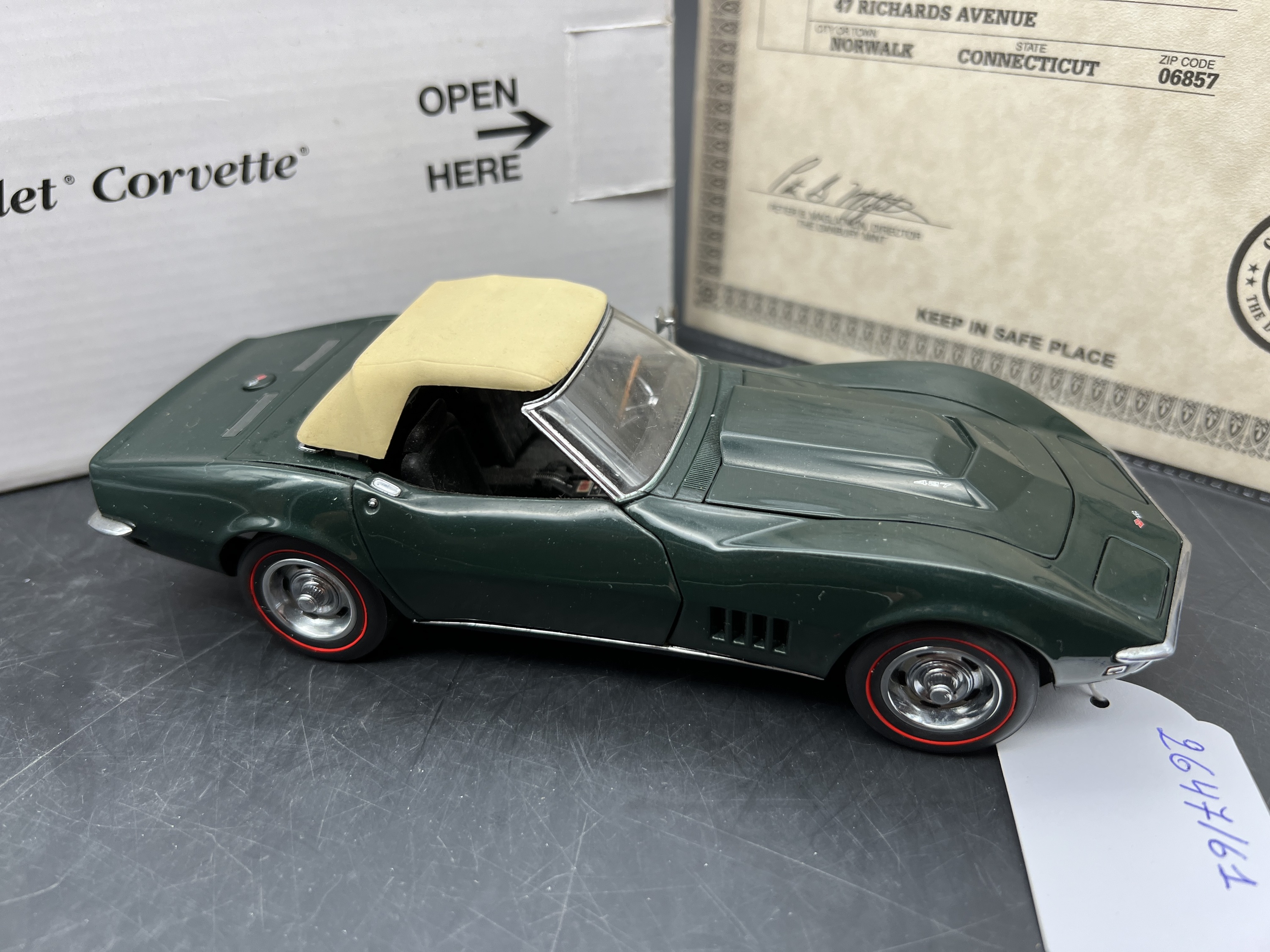 Danbury Mint Model 1/24è, Voiture Chevrolet corvette convertible British green 1968, boite + certificat