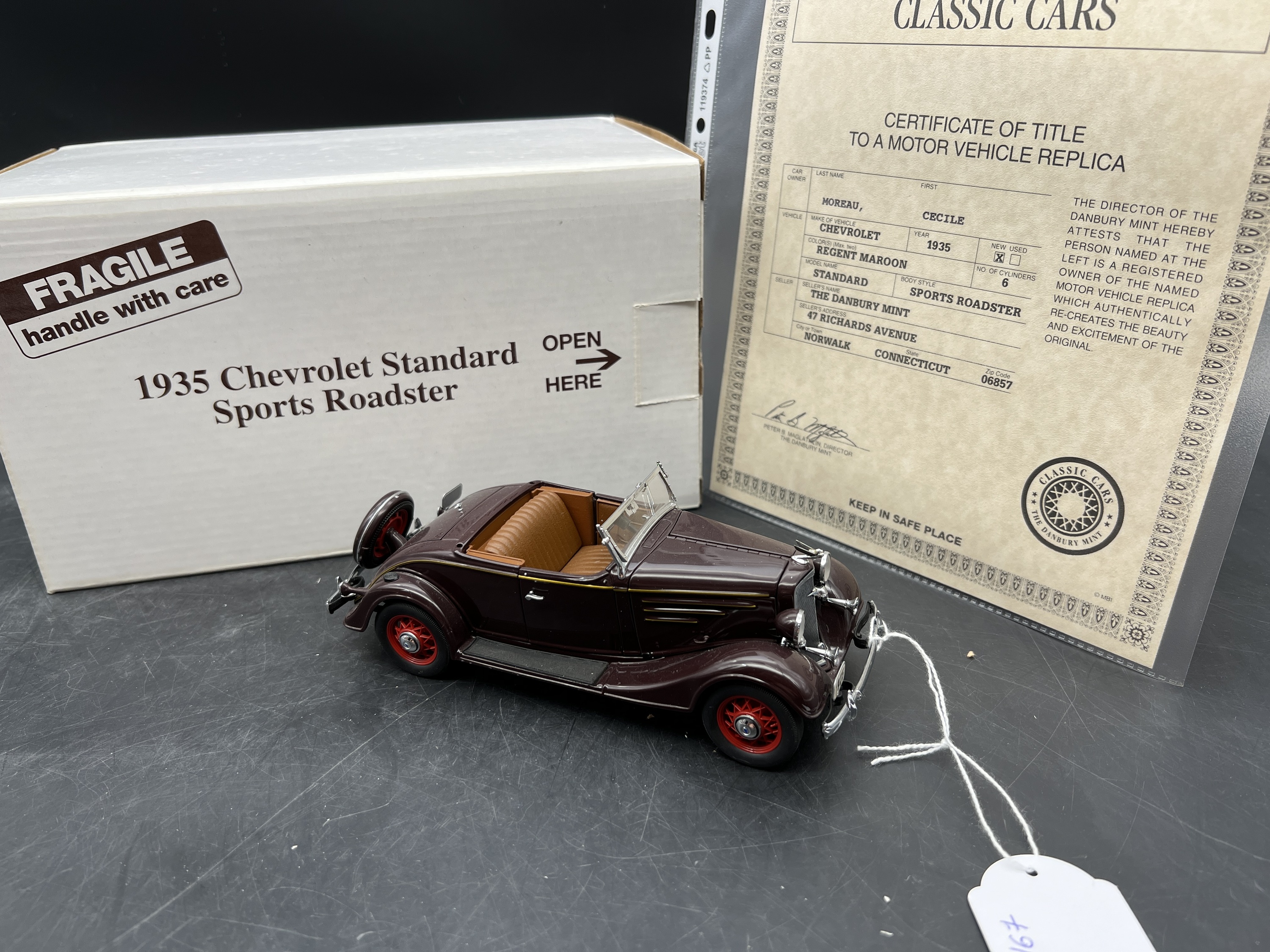 Danbury Mint Model 1/24è, Voiture Chevrolet STandard Sports Roadster REgent Maroon 1935, boite + certificat