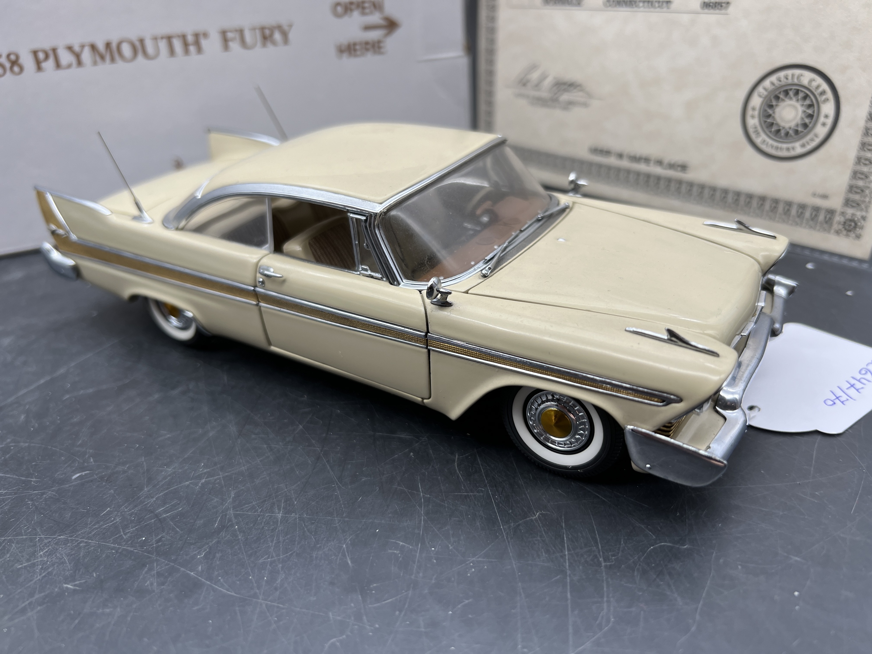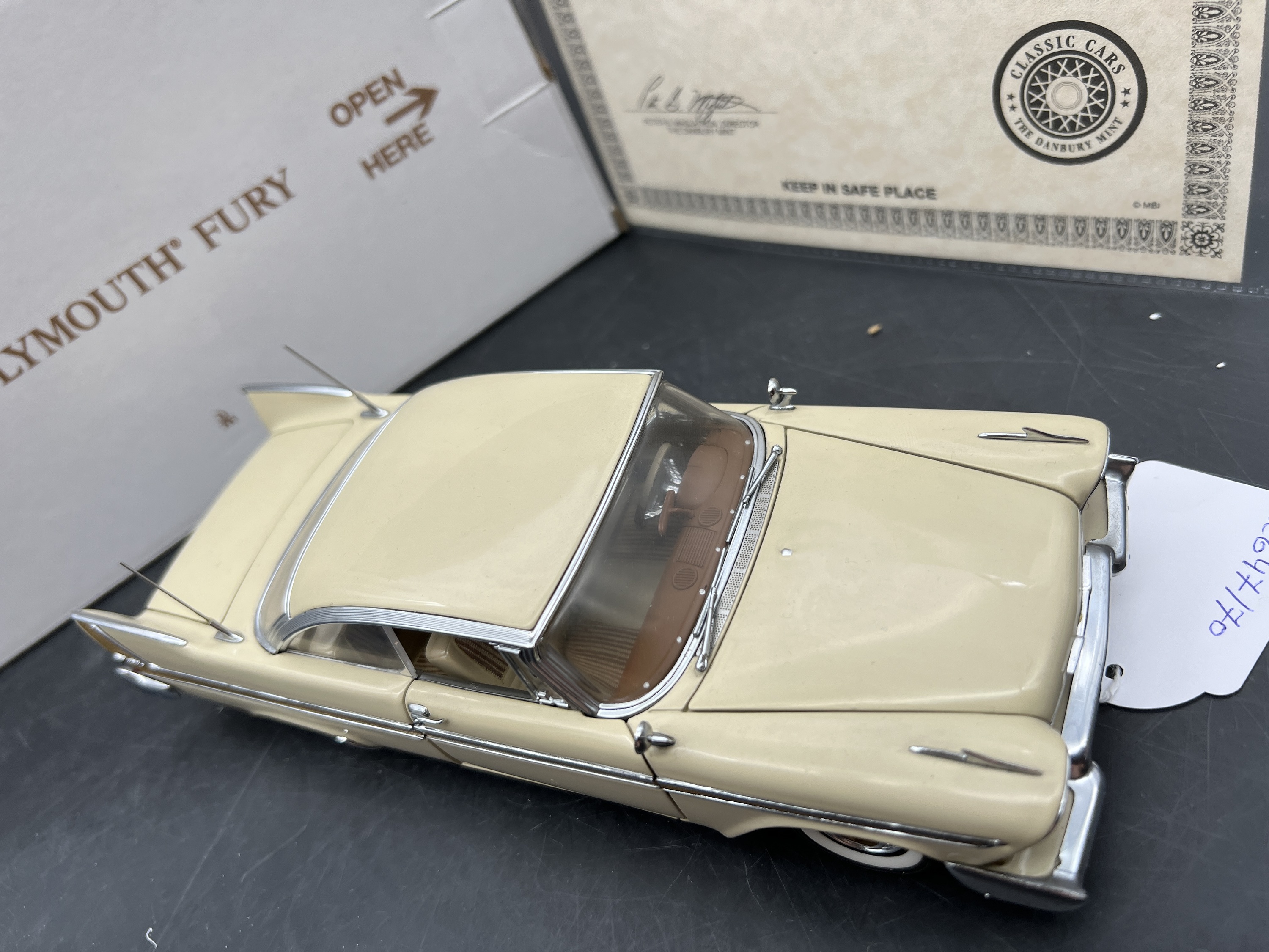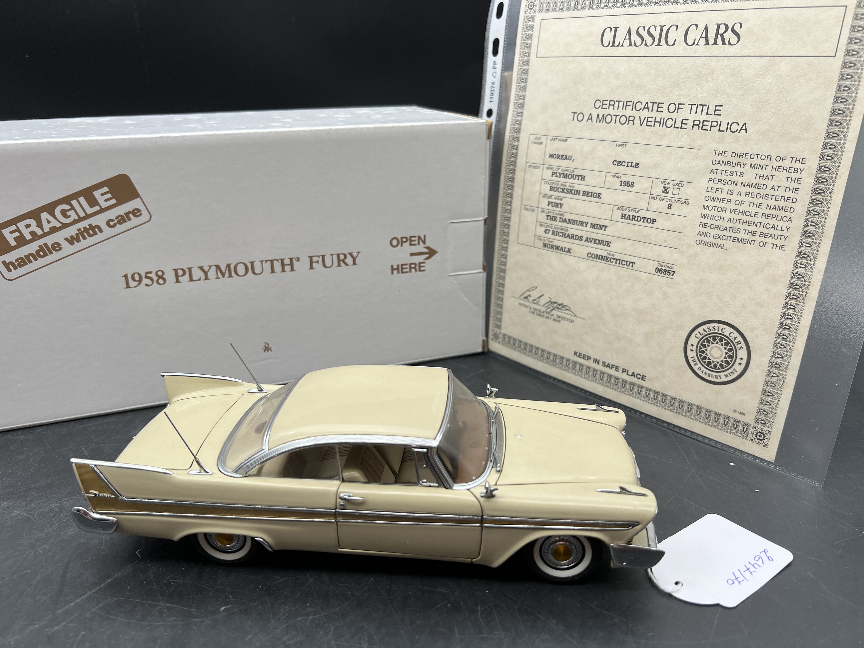 Danbury Mint Model 1/24è, Voiture Plymouth Fury Hardtop Buckskin beige 1958, boite + certificat