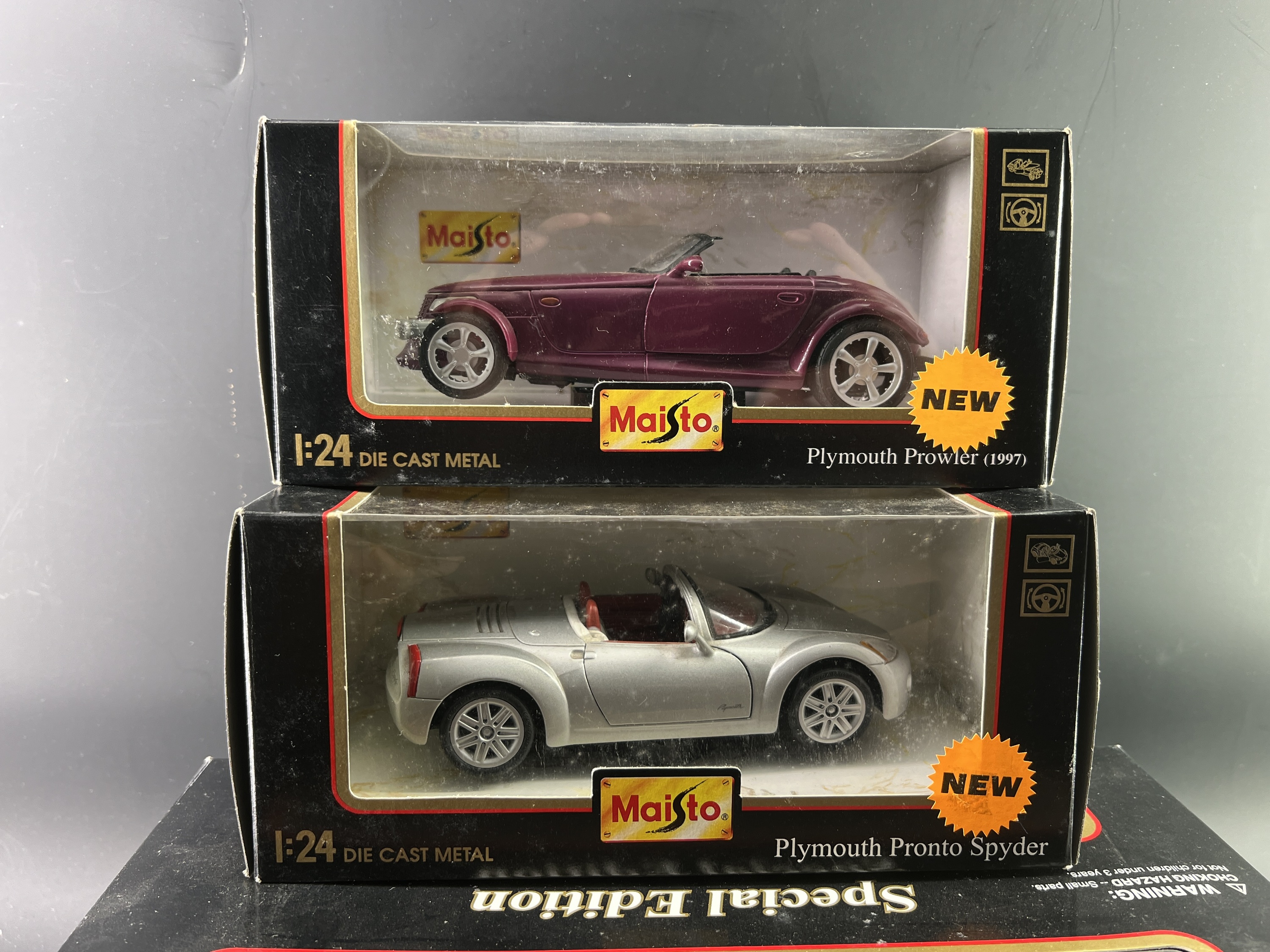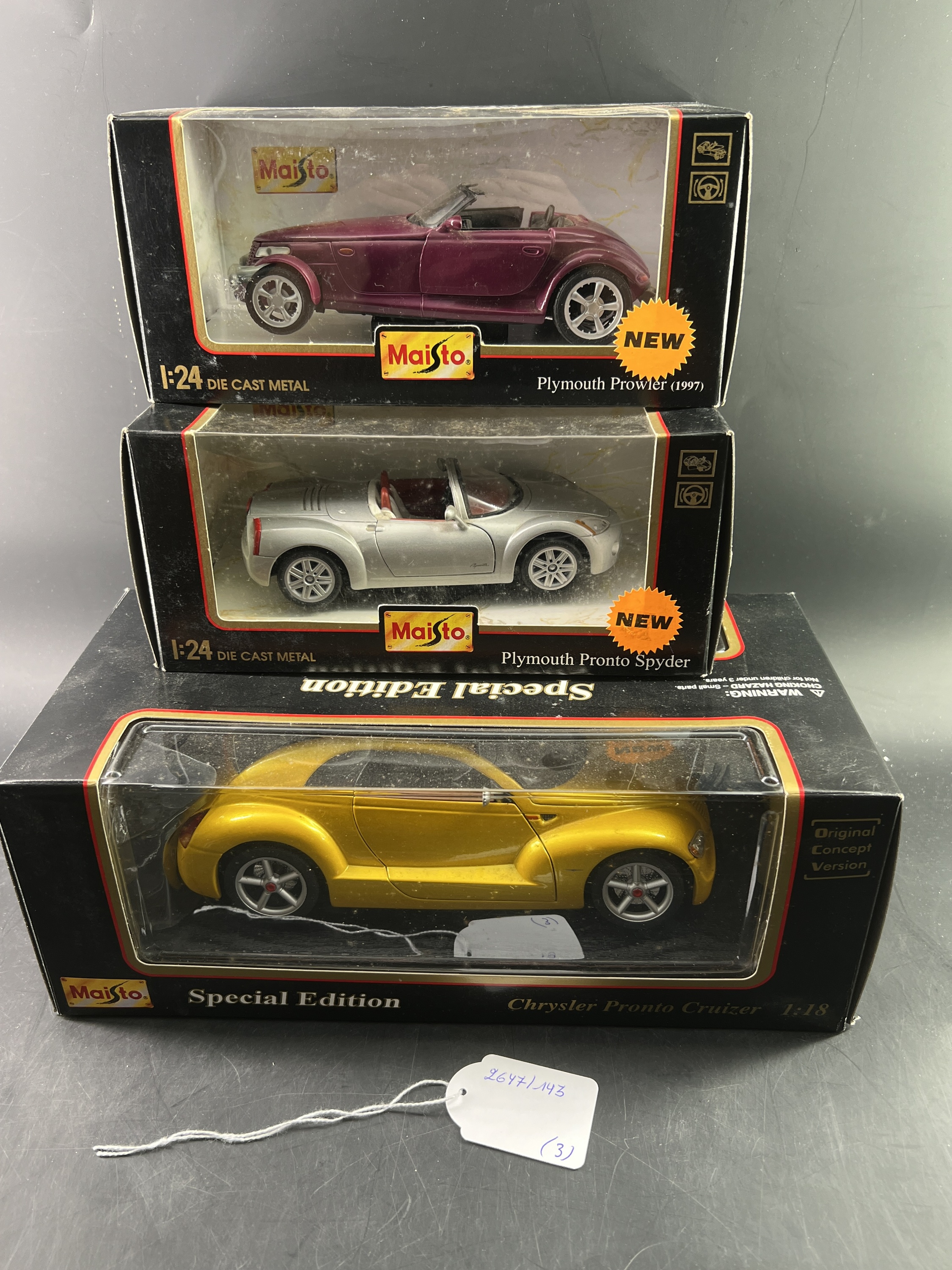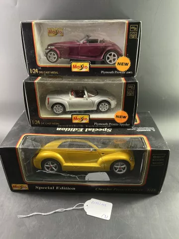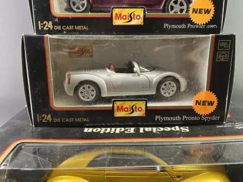 Lot de 3 Maisto avec boite 1/18ème et 1/24ème: Plymouth Prowler 1997, Plymouth Pronto Spyder, Chrysler Pronto Cruiser